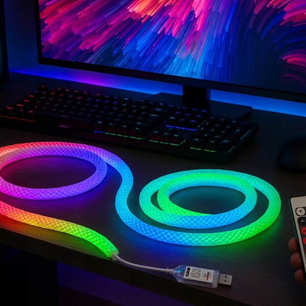 Zestaw NEON LED 10M 5V Bluetooth RGB-IC to nowoczesna taśma LED w technologii elastycznego neonu, która pozwala tworzyć niesamowite efekty świetlne w każdym wnętrzu. Dzięki sterowaniu przez aplikację mobilną, pilot i moduł Bluetooth masz pełną kontrolę nad kolorami, trybami świecenia i efektami dynamicznymi. To idealne rozwiązanie do dekoracji wnętrz, imprez, projektów DIY i profesjonalnych instalacji….