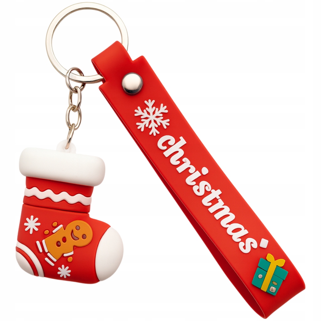 Brelok został wykonany z miękkiego i elastycznego tworzywa, dlatego jest przyjemny w dotyku oraz bezpieczny w codziennym użytkowaniu. Co więcej, wyposażony jest w czerwony pasek z napisem Christmas, śnieżynką oraz motywem prezentu, przez co całość wygląda słodko, kolorowo i bardzo świątecznie.