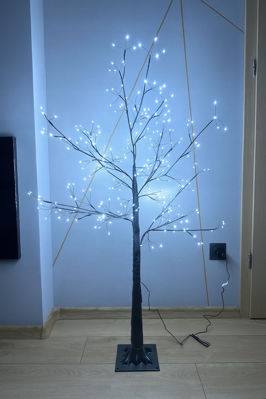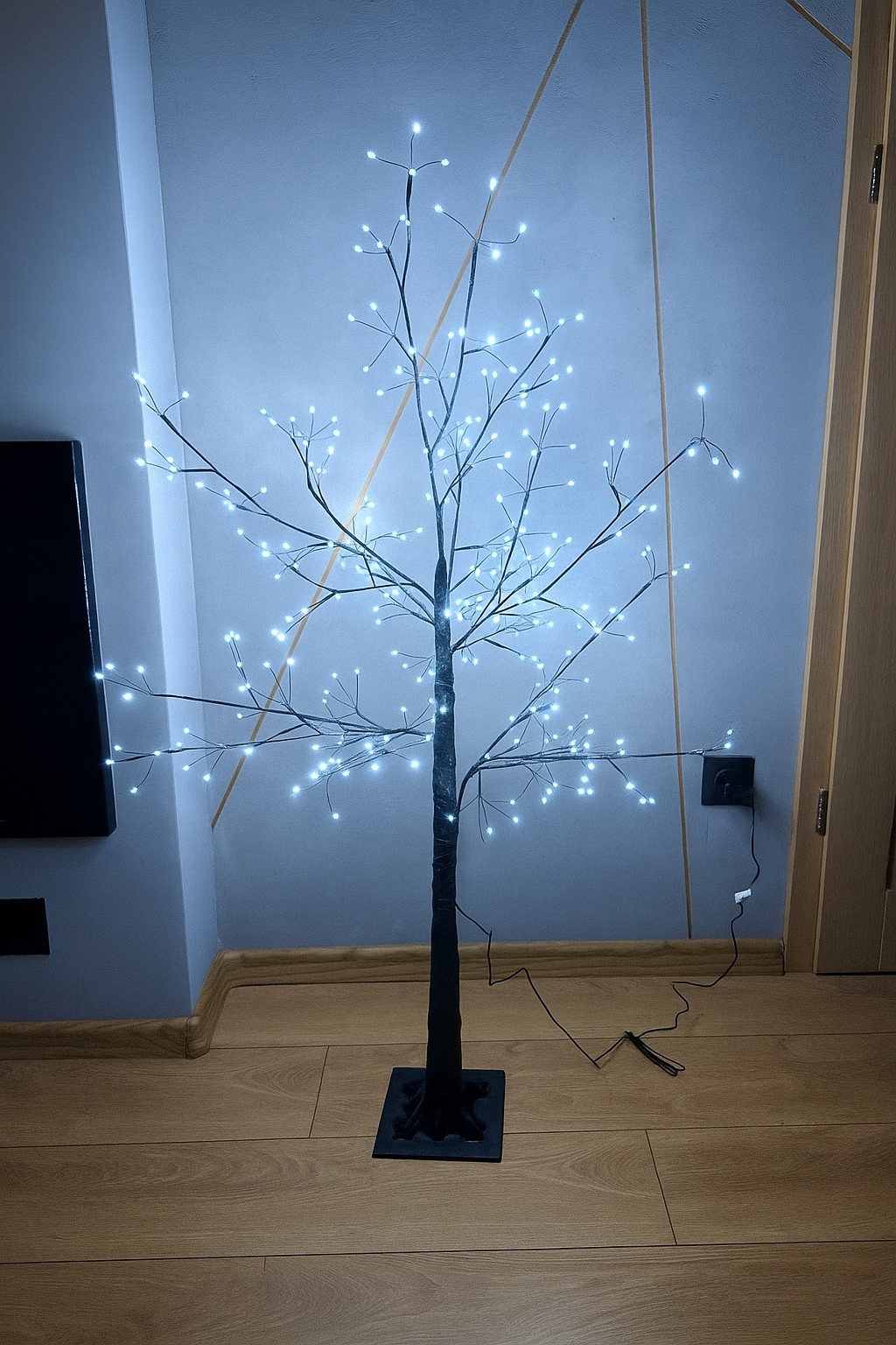 Eleganckie drzewko świąteczne 130 cm z aż 288 mikro LED w barwie białej zimnej. Smukły, czarny pień i subtelne gałązki dają efekt „iskier”. Stabilna podstawa 17×17 cm z otworami montażowymi. Montaż w 2 częściach: podstawa / pień z koroną