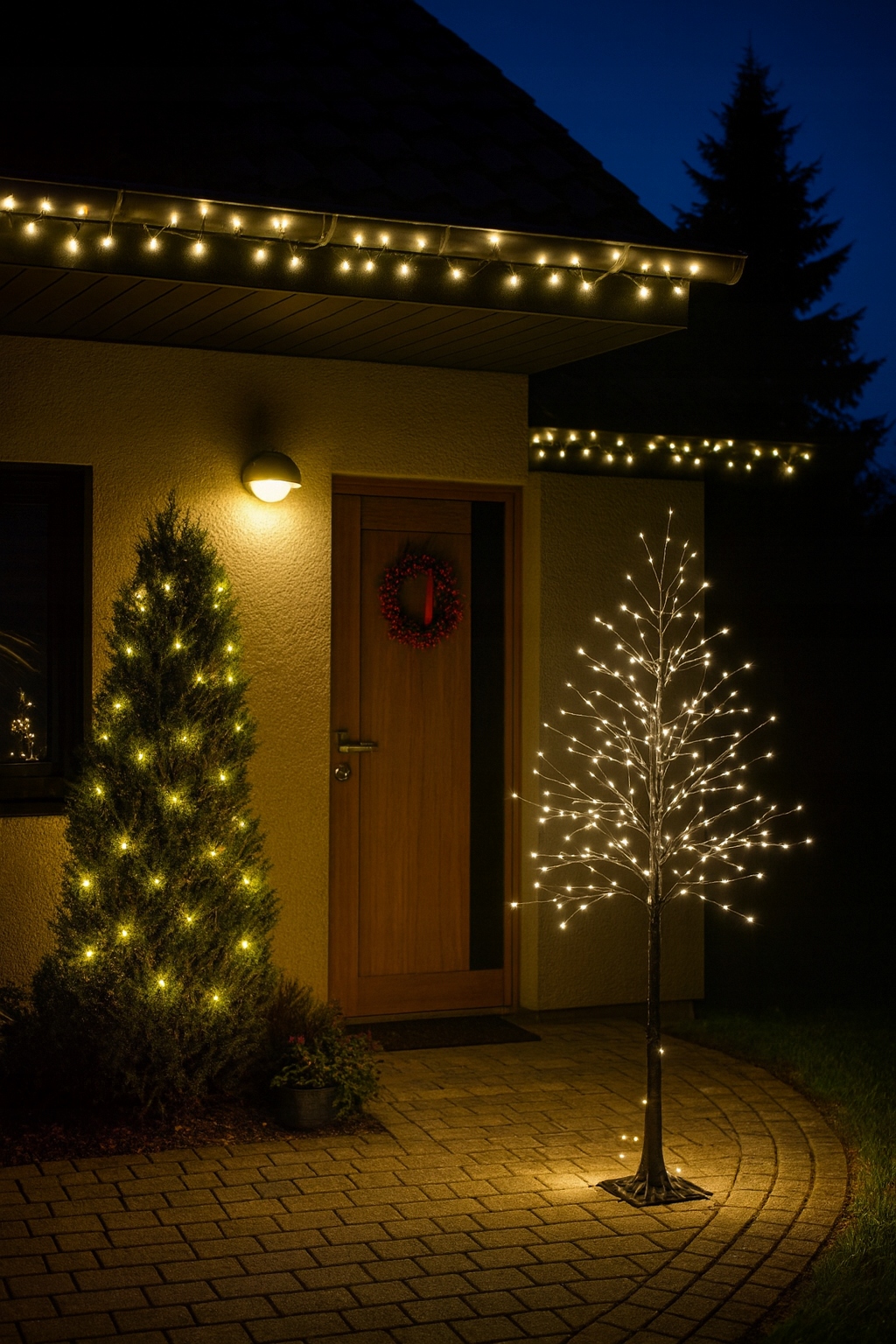 Drzewko świąteczne LED w formie brzozy o wysokości około 180 cm to elegancka dekoracja świetlna, ponieważ łączy naturalny wygląd z nowoczesnym oświetleniem LED. Dzięki zastosowaniu 245 diod LED w ciepłej barwie światła 3500K, dekoracja tworzy przytulny klimat, a jednocześnie nadaje wnętrzom i przestrzeniom reprezentacyjnym ekskluzywny charakter.