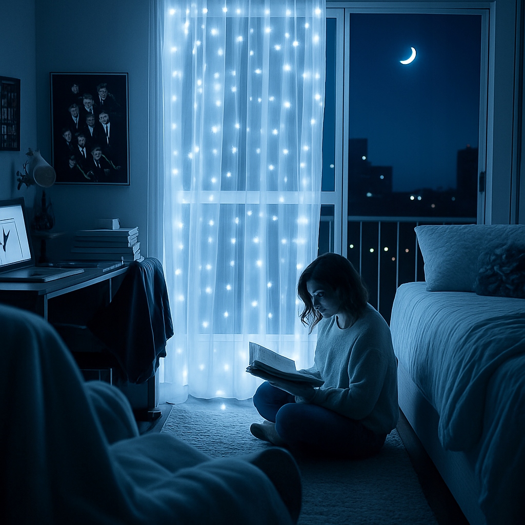 Zimna biel nadaje aranżacji czysty i świeży charakter, ponieważ światło jest jasne i wyraźne. Dzięki temu kurtyna pięknie podkreśla ściany, okna oraz elementy wystroju. Co więcej, gęste rozmieszczenie mikro LED sprawia, że światło rozkłada się równomiernie, a więc całość wygląda estetycznie zarówno z bliska, jak i z większej odległości.