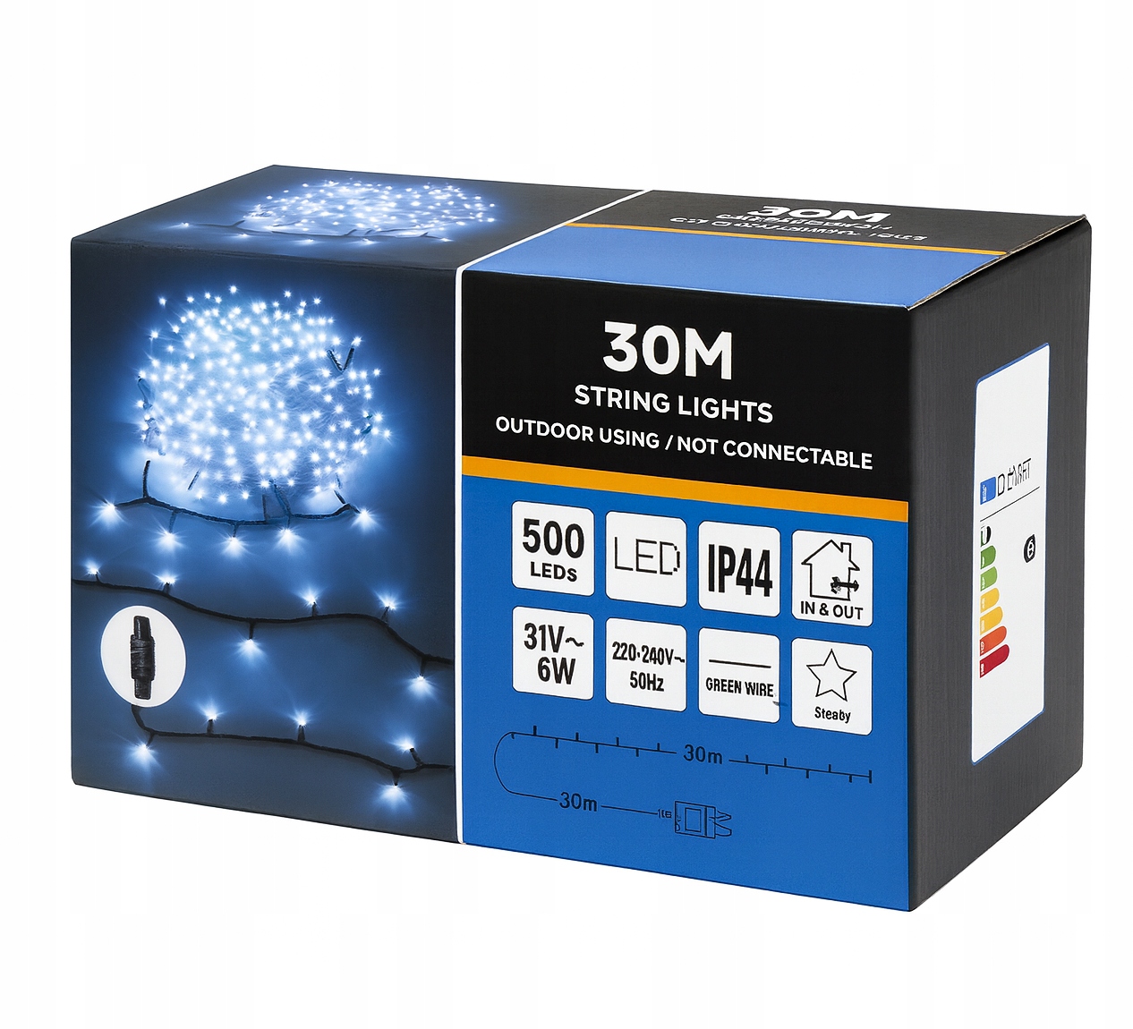 Dzięki 500 energooszczędnym diodom LED w barwie zimnej bieli (31V) stworzysz elegancką i nowoczesną atmosferę świąteczną zarówno wewnątrz, jak i na zewnątrz domu. Klasa szczelności IP44 gwarantuje odporność na deszcz, śnieg i mróz.