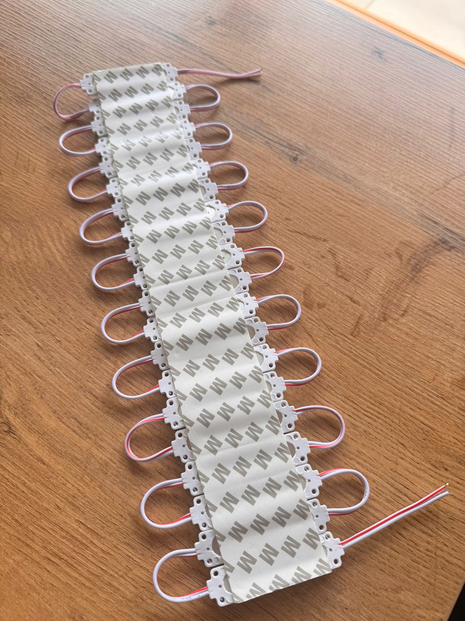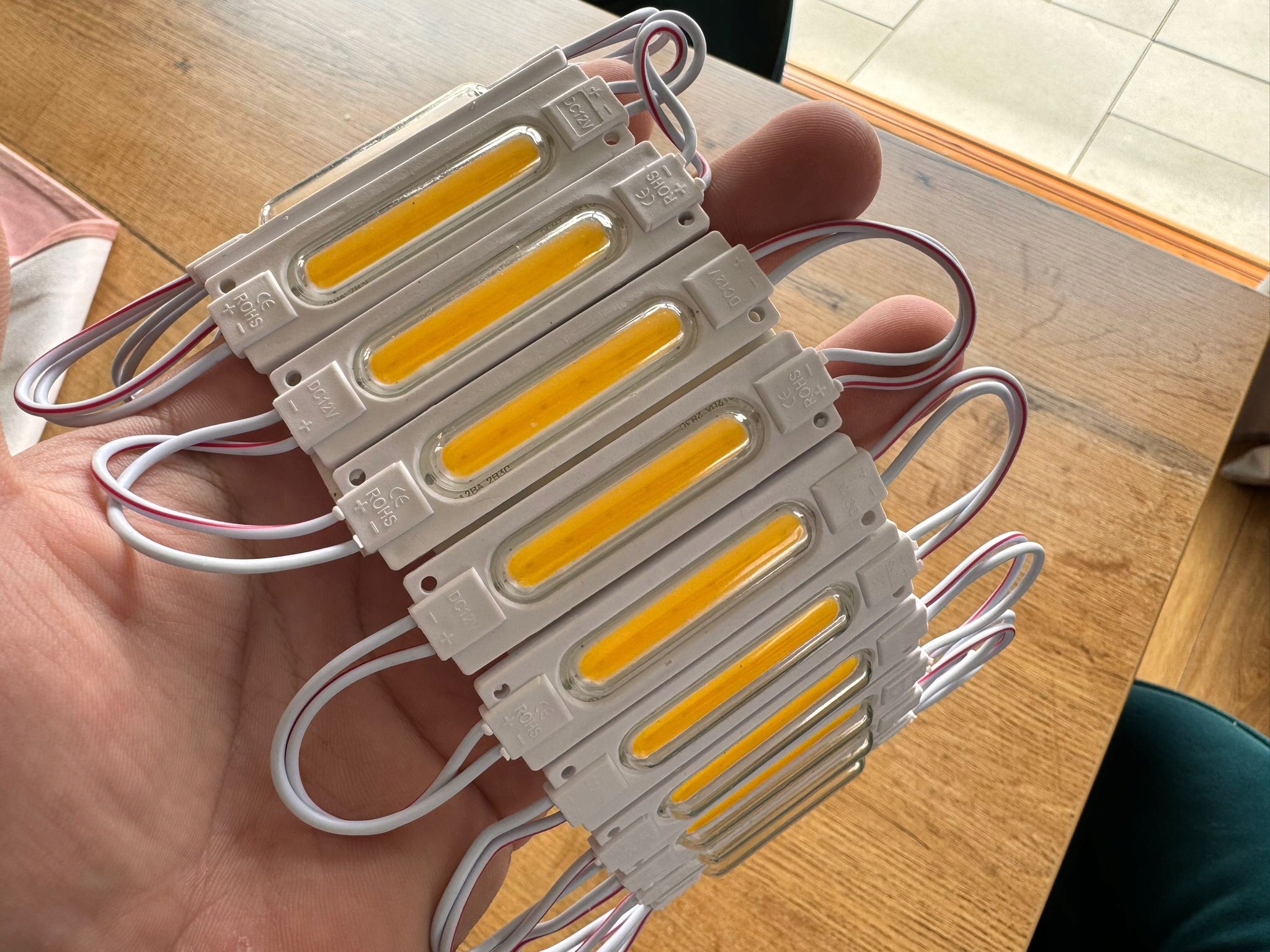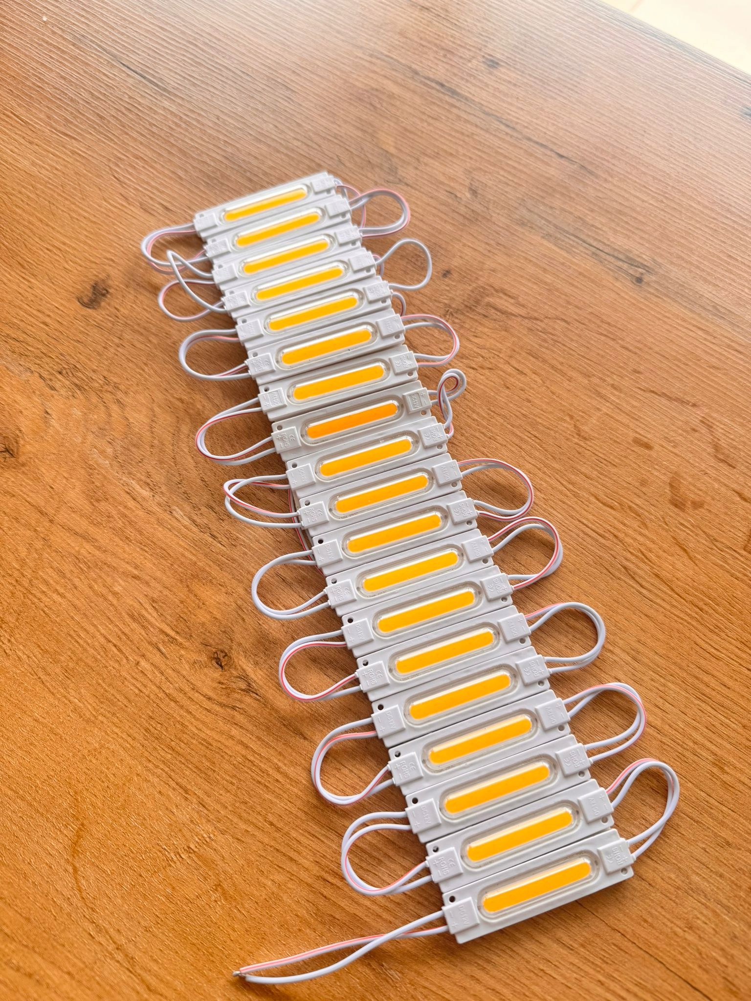Każdy moduł LED COB zawiera 6 diod i generuje około 210 lumenów światła. Moc wynosi 3W, a pobór prądu pozostaje niski, co zapewnia wysoką wydajność i oszczędność energii. Moduły sprzedawane są w zestawach po 20 sztuk, ale dzięki lutowaniu można je łatwo łączyć w dłuższe ciągi.