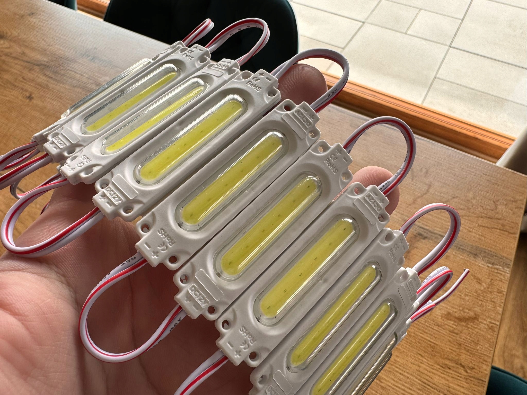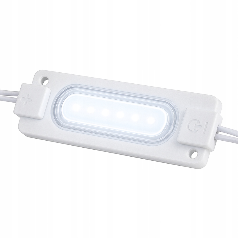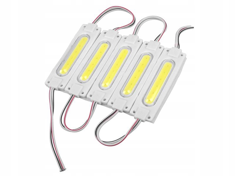 Każdy moduł LED zawiera 6 diod COB, które razem emitują około 210 lumenów światła. Moc wynosi 3W, a pobór prądu jest niski, co gwarantuje energooszczędność. Moduły dostarczane są fabrycznie w zestawach po 20 sztuk, z możliwością łączenia w dłuższe ciągi dzięki lutowaniu przewodów.