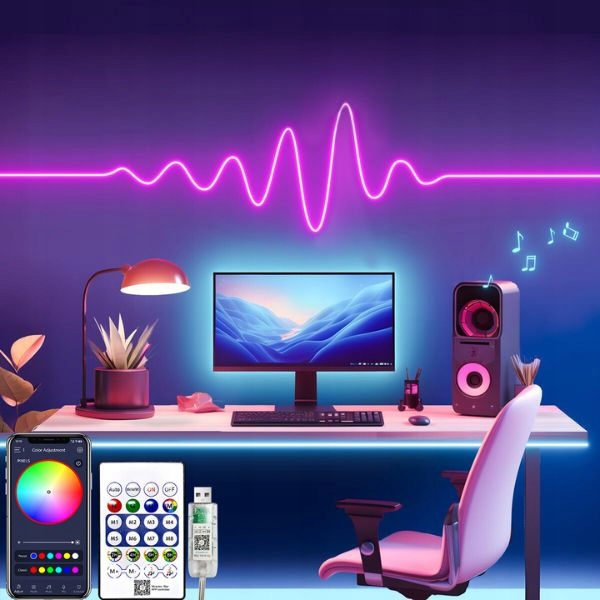 Taśma LED Neon Flex to rozwiązanie typu plug&play – w zestawie otrzymujesz kompletną rolkę 5 m, pilot oraz uchwyty montażowe. Zasilanie odbywa się przez USB 5V DC, co sprawia, że neon jest całkowicie bezpieczny i może być używany zarówno w domu, jak i w przestrzeniach publicznych.