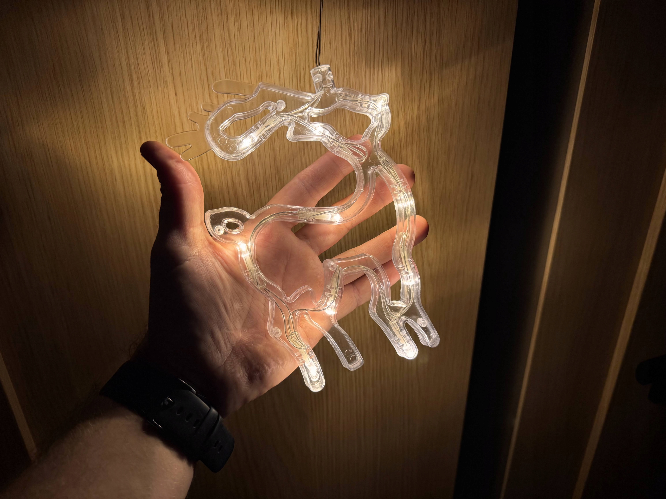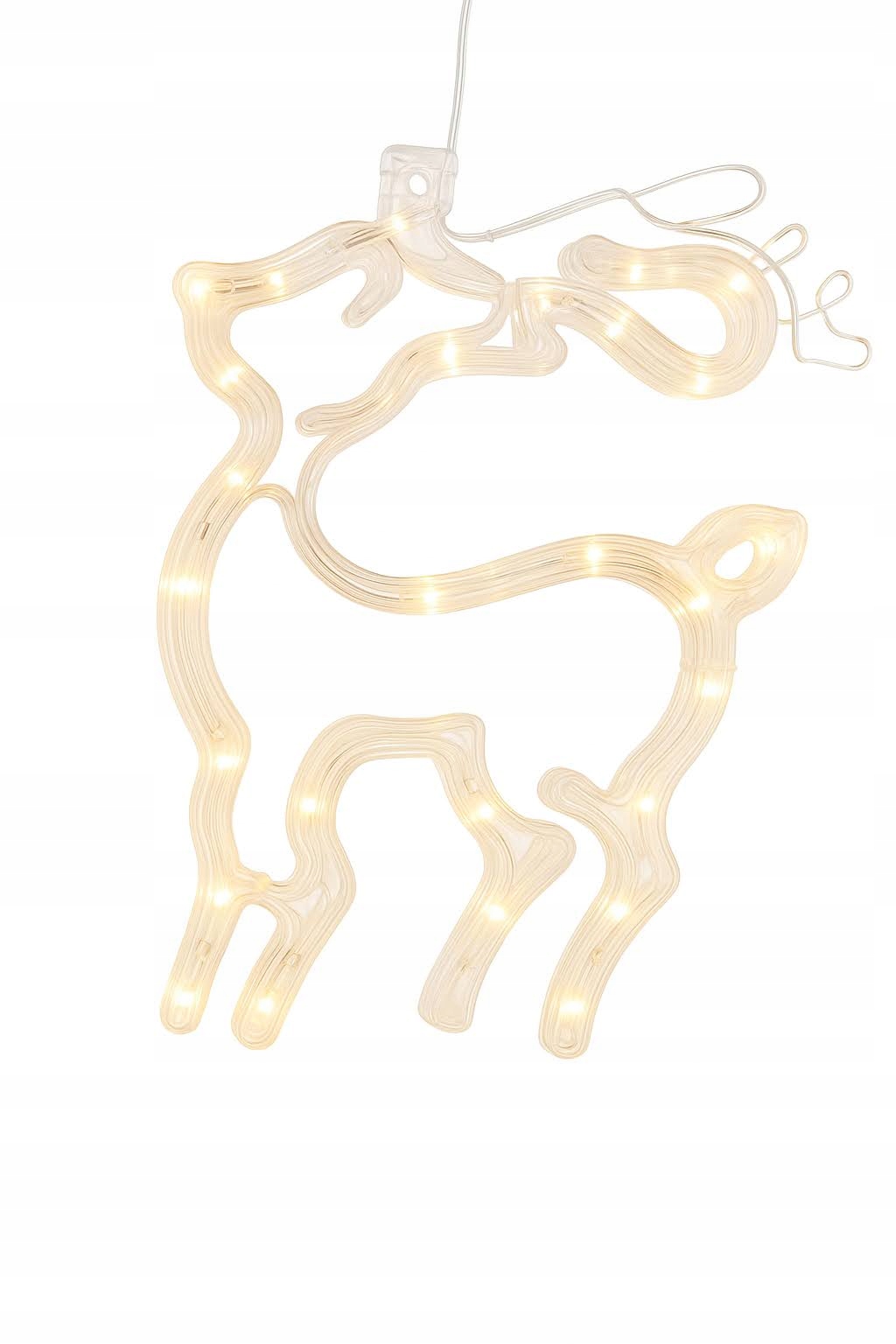 Ozdoba świeci w barwie ciepłej białej, która świetnie pasuje do klasycznych dekoracji bożonarodzeniowych. Przezroczysta konstrukcja pięknie rozprasza światło, dzięki czemu renifer wygląda efektownie zarówno w dzień, jak i w nocy.