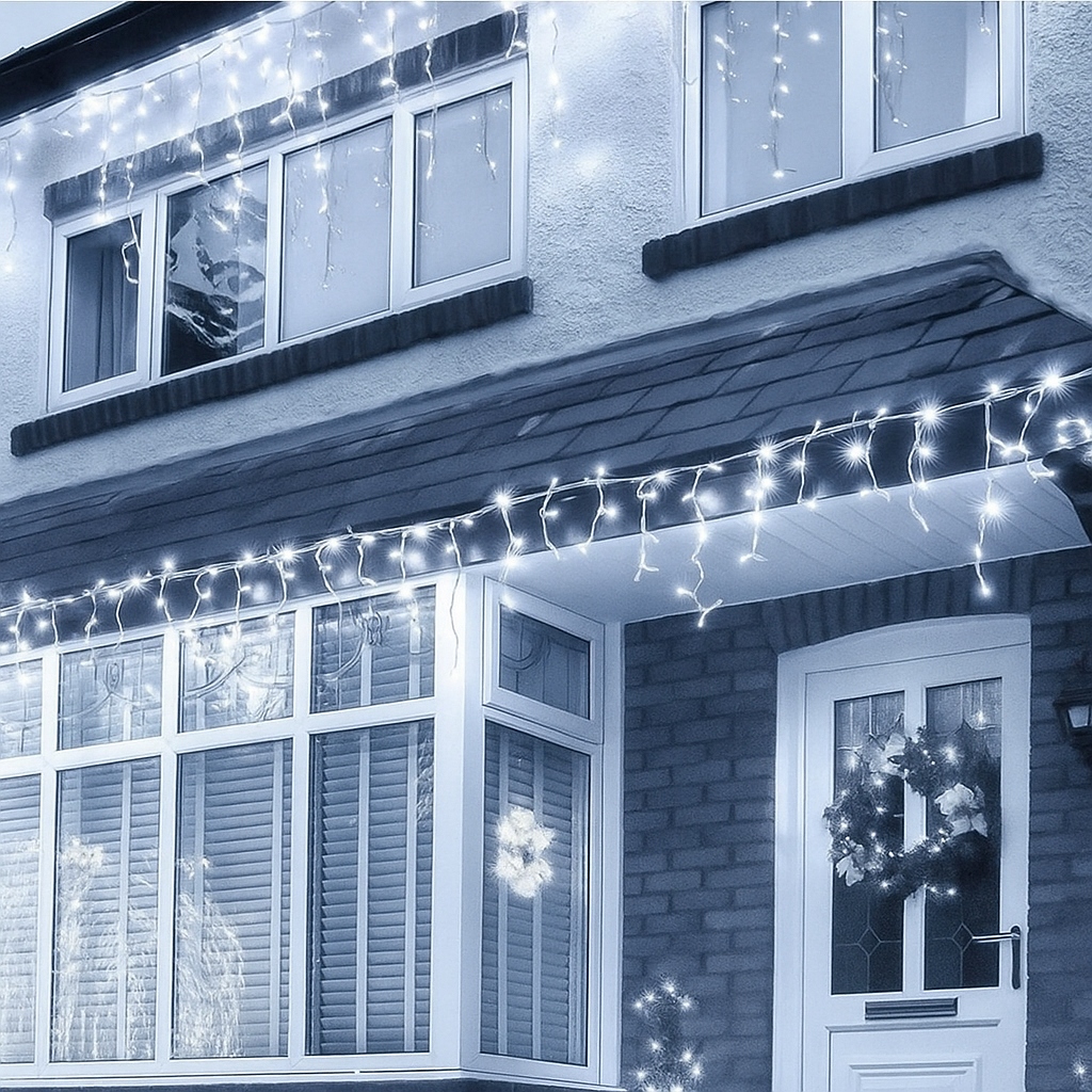 Zwisy o długości 30, 50 i 70 cm tworzą naturalny, lodowy wzór. Przewód wykonano z grubej gumy, więc lepiej znosi mróz, zginanie i warunki atmosferyczne niż zwykłe PVC. Dodatkowym atutem są hermetyczne złączki 2-pin. Dzięki nim można połączyć kilka zestawów i uzyskać dłuższą linię światła, dopasowaną do budynku lub ogrodzenia.