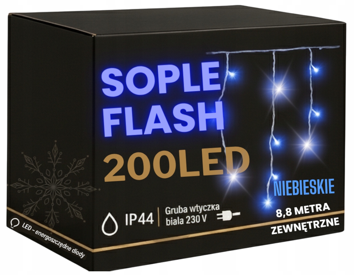 Kurtyna świetlna z 200 niebieskimi diodami LED to gotowy zestaw do dekoracji zewnętrznych i pod zadaszeniem. Niebieskie światło tworzy nowoczesny, chłodny klimat, natomiast efekt FLASH sprawia, że wybrane diody delikatnie migoczą, gdy reszta świeci stabilnie. Dzięki temu oświetlenie wygląda elegancko, a zarazem subtelnie.