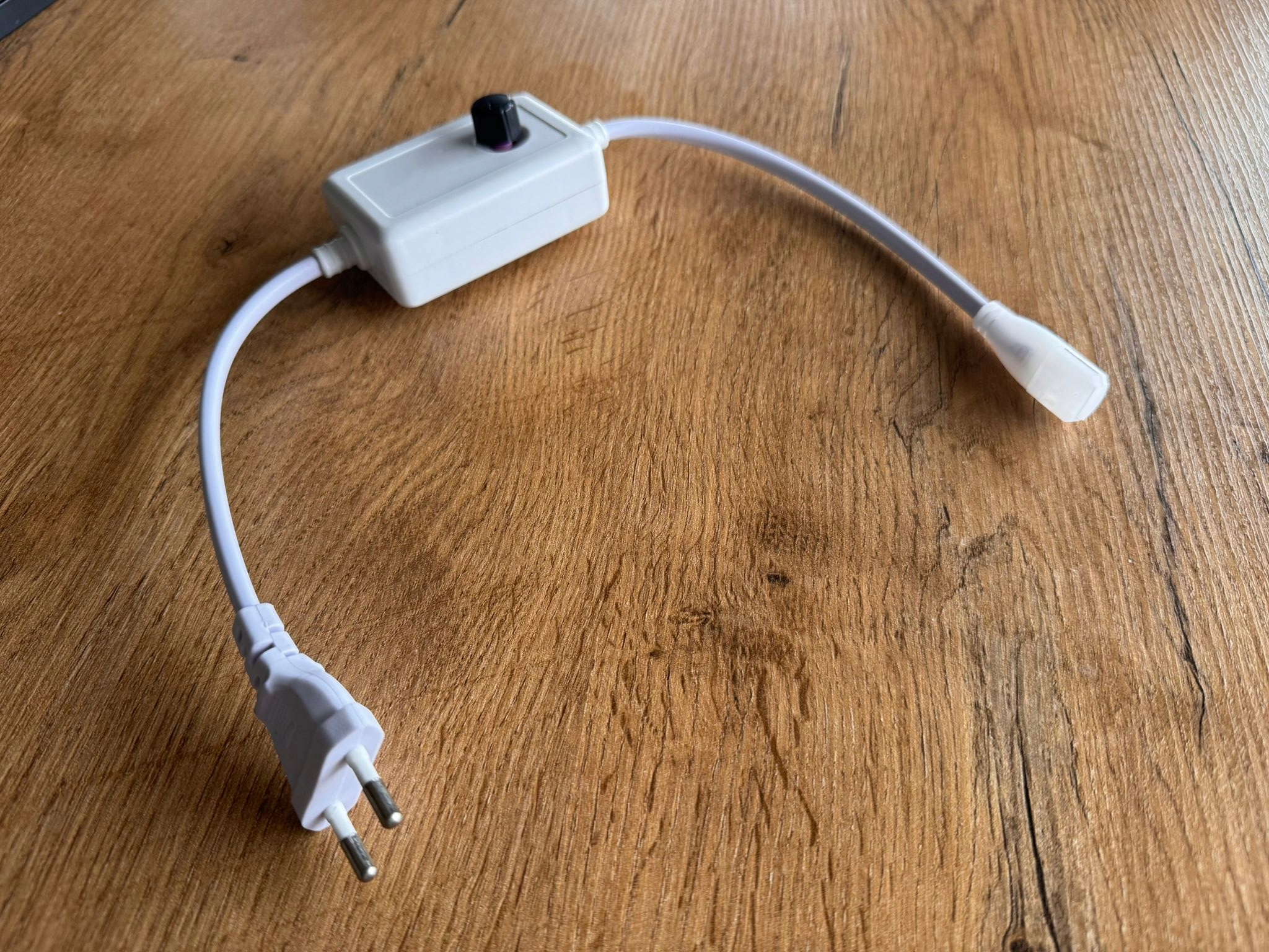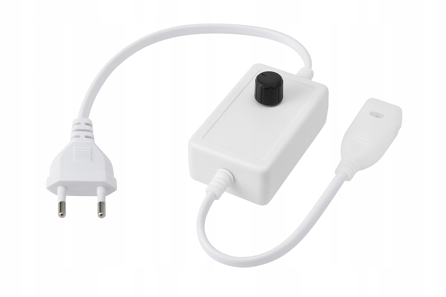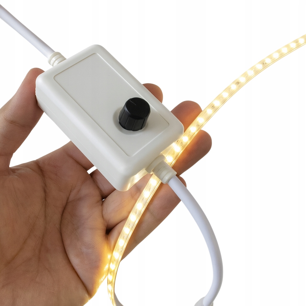 Stabilizator napięcia ze ściemniaczem to kompletny przewód z prostownikiem i pokrętłem, przeznaczony do taśm LED 230V SMD i COB 10 mm, ciętych co 10 cm. Urządzenie umożliwia płynną regulację jasności (do ok. 50%), a także włączanie i wyłączanie światła bezpośrednio z pokrętła.