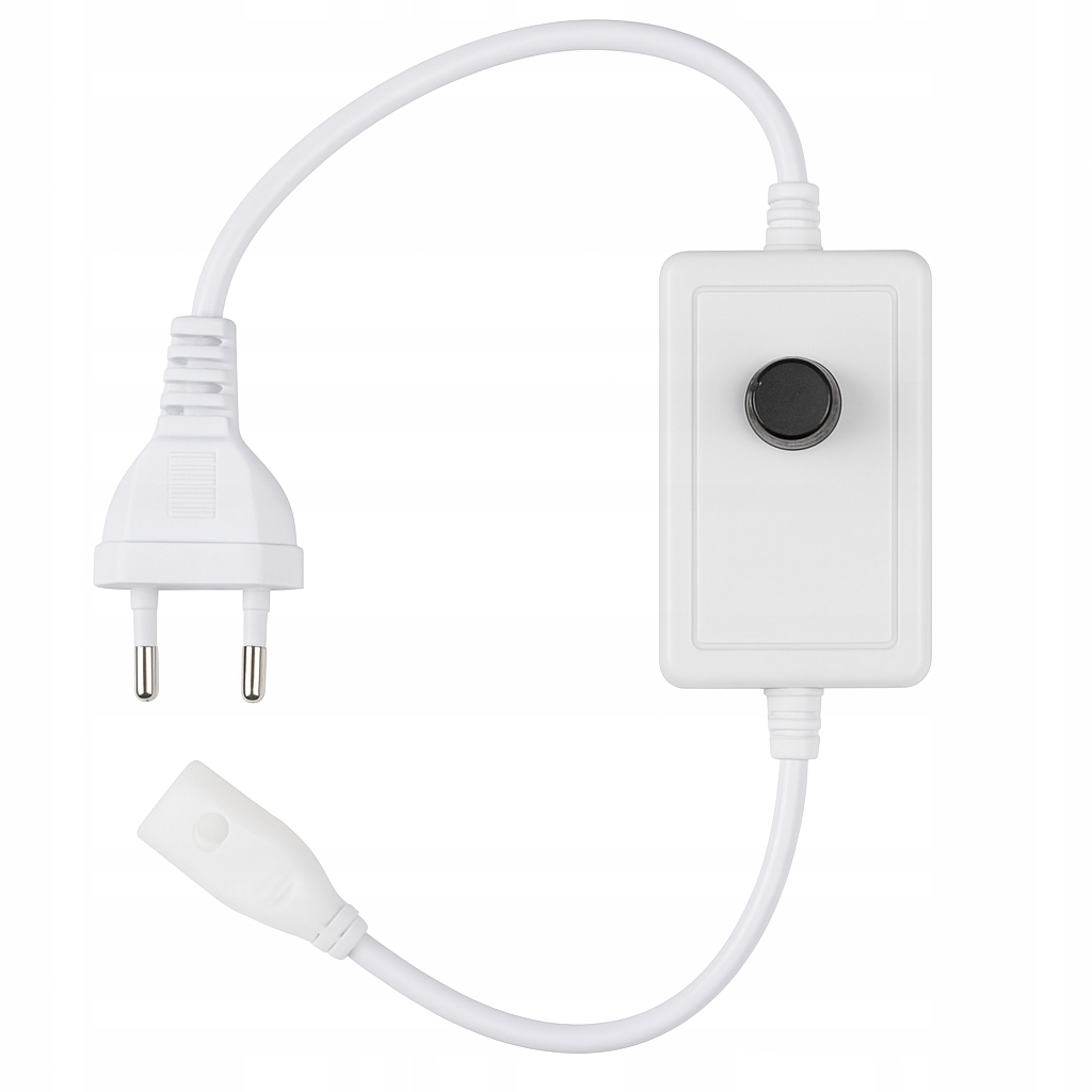 Stabilizator napięcia z pokrętłem (ściemniaczem) to praktyczny przewód z prostownikiem i regulacją jasności, stworzony do taśm LED COB 12 mm 230V oraz neonów LED 230V 2-pin. Urządzenie pełni funkcję zasilacza, stabilizatora i ściemniacza, dlatego pozwala łatwo sterować światłem jednym ruchem pokrętła.