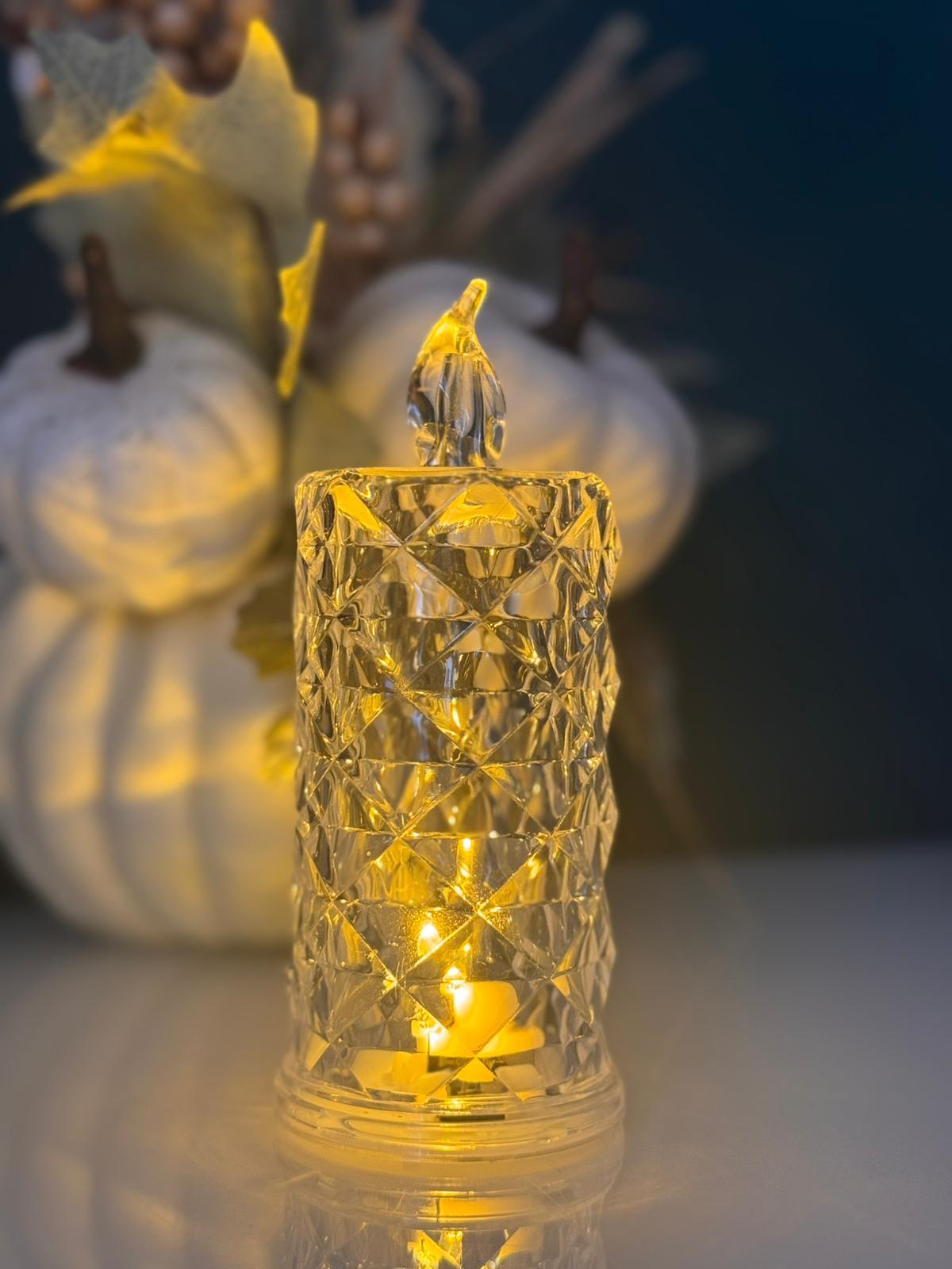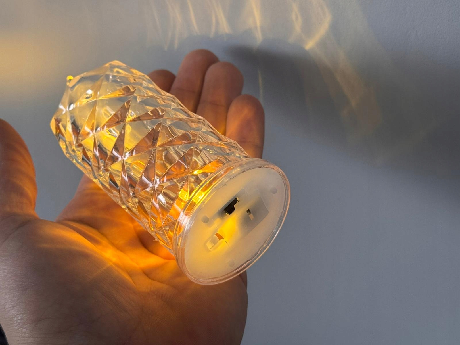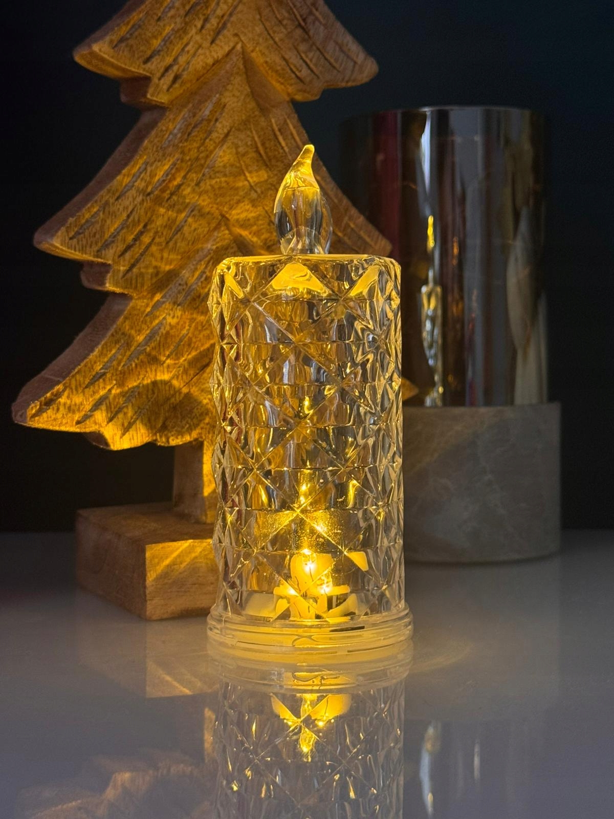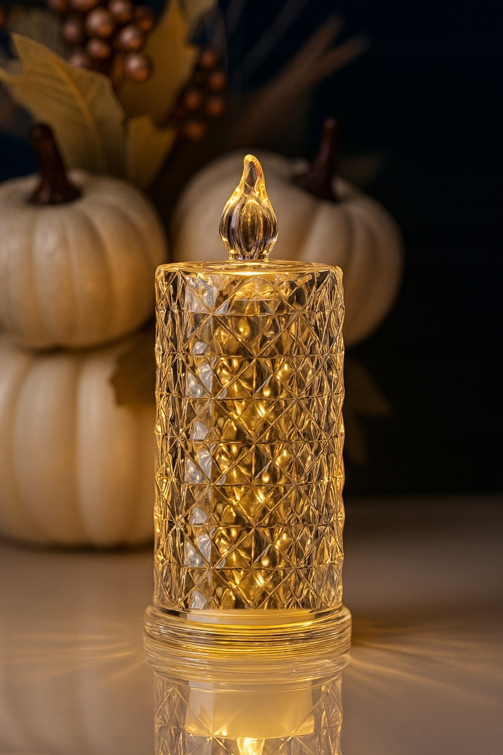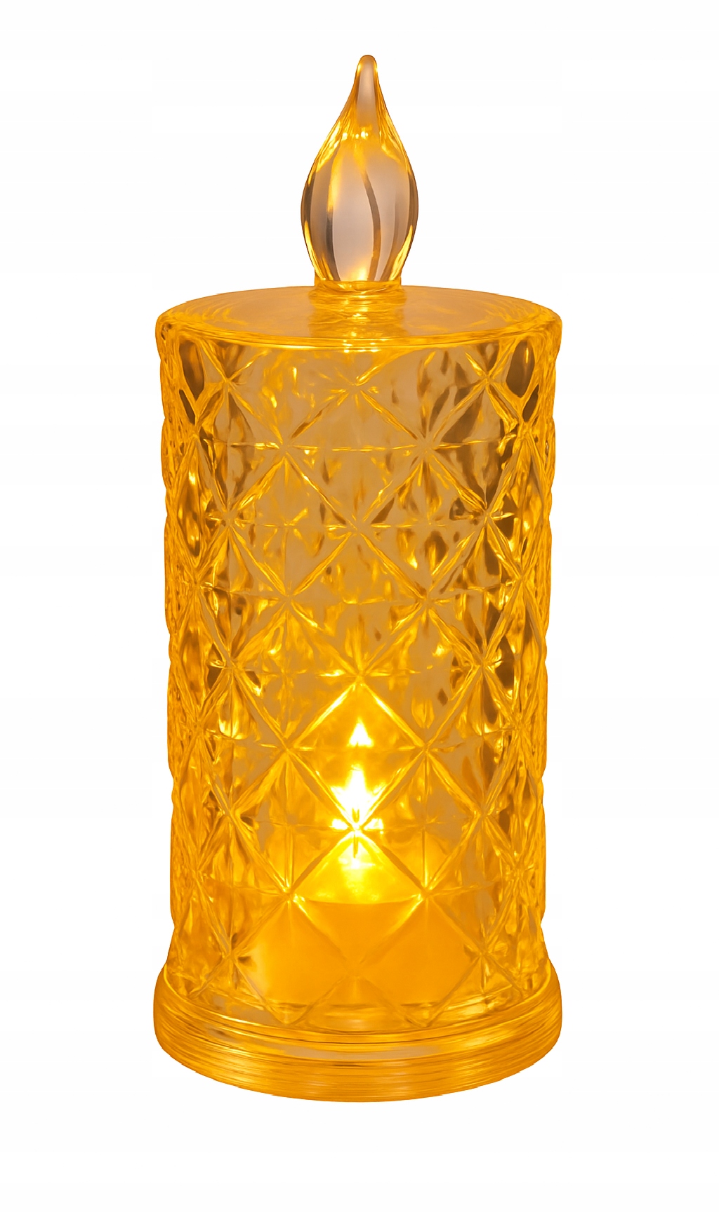 Producent zastosował przezroczystą obudowę stylizowaną na szkło, dzięki czemu lampion prezentuje się elegancko i nowocześnie. Dekoracyjny diamentowy motyw załamuje światło, co sprawia, że całość wygląda efektownie zarówno w dzień, jak i po zmroku. Dzięki temu lampka pasuje do klasycznych oraz nowoczesnych aranżacji.