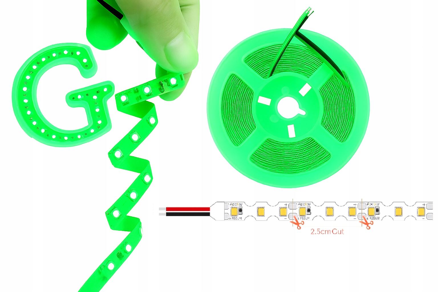 Elastyczna taśma LED 12V 2835 S-Shape zielona doskonale sprawdzi się przy tworzeniu napisów neonowych, podświetleń witryn, schodów, mebli, sufitów oraz aranżacji reklamowych. Smukłe podłoże PCB (6 mm) ułatwia montaż nawet w wąskich miejscach, a sekcja cięcia co 2,5 cm (3 diody) daje możliwość idealnego dopasowania długości.