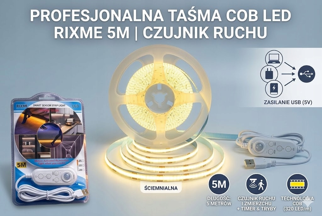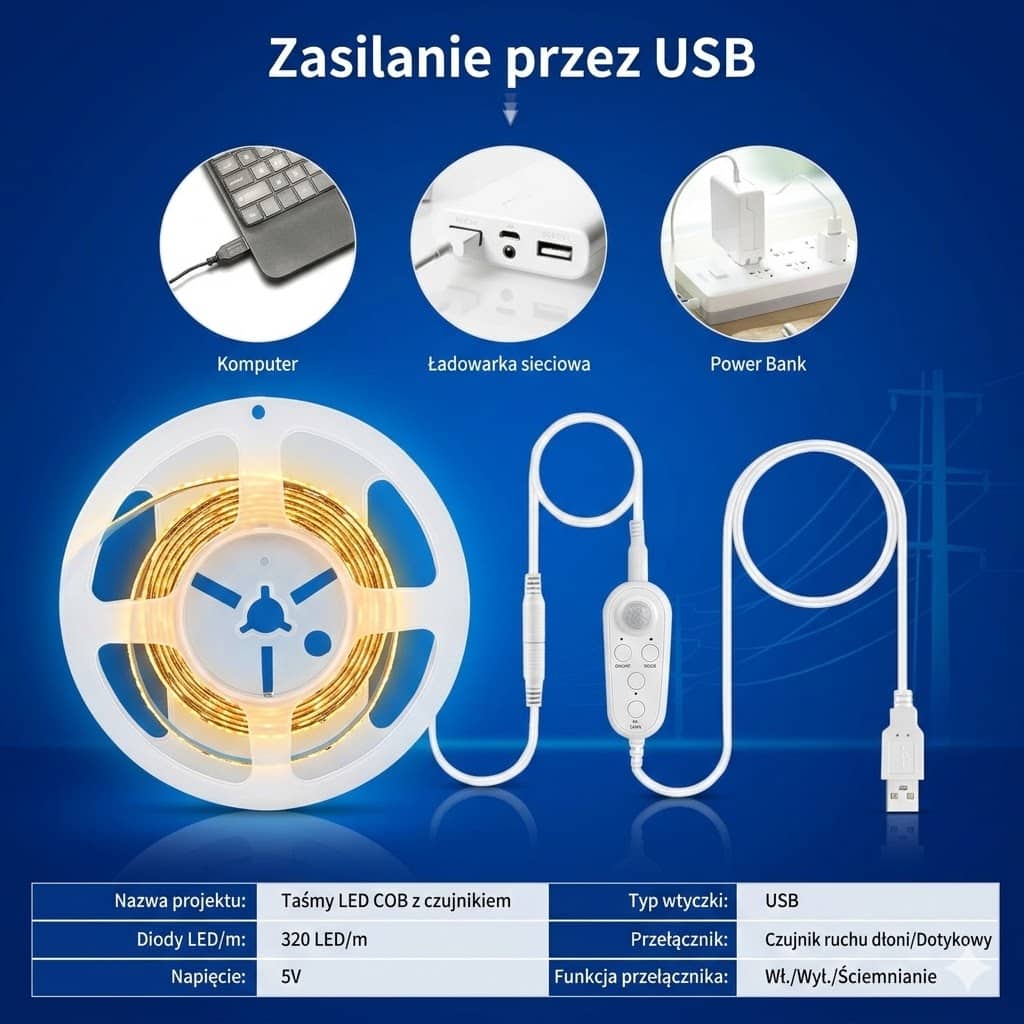 Taśma LED COB USB 5m 4000K z Czujnikiem Ruchu