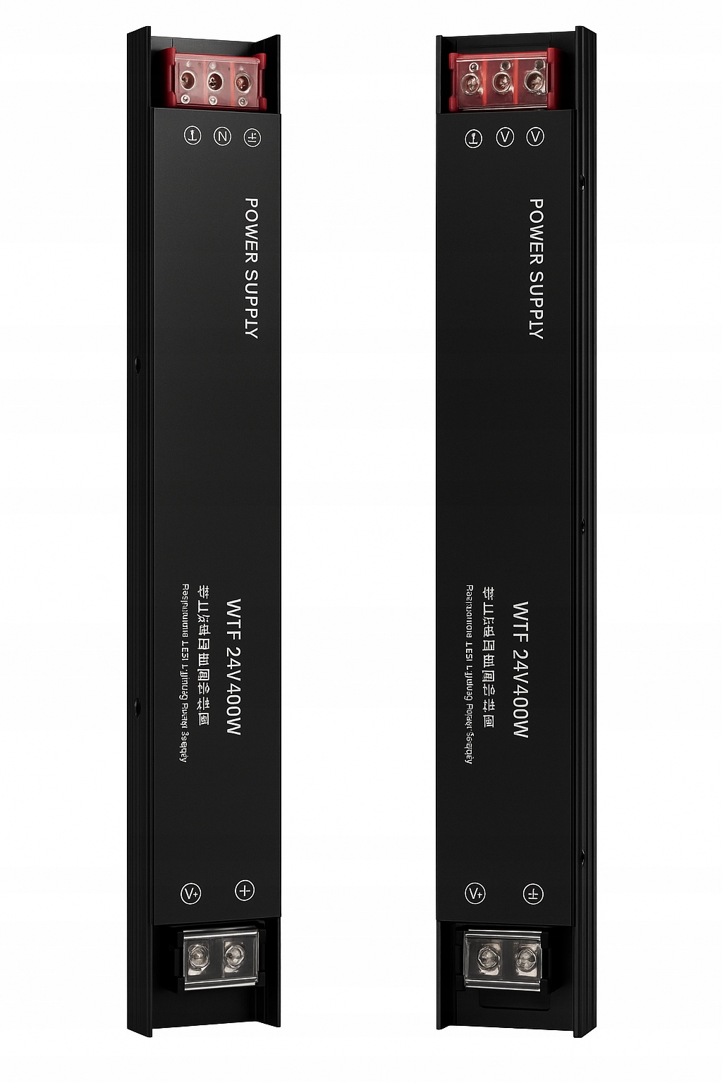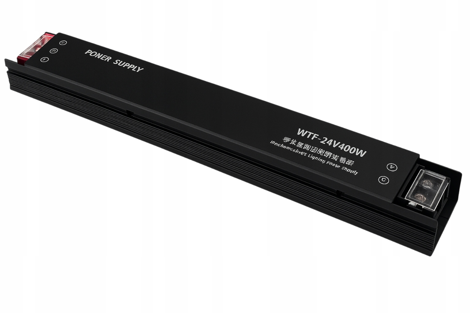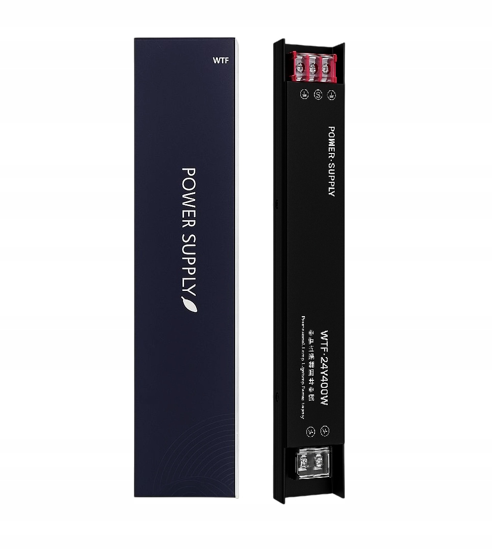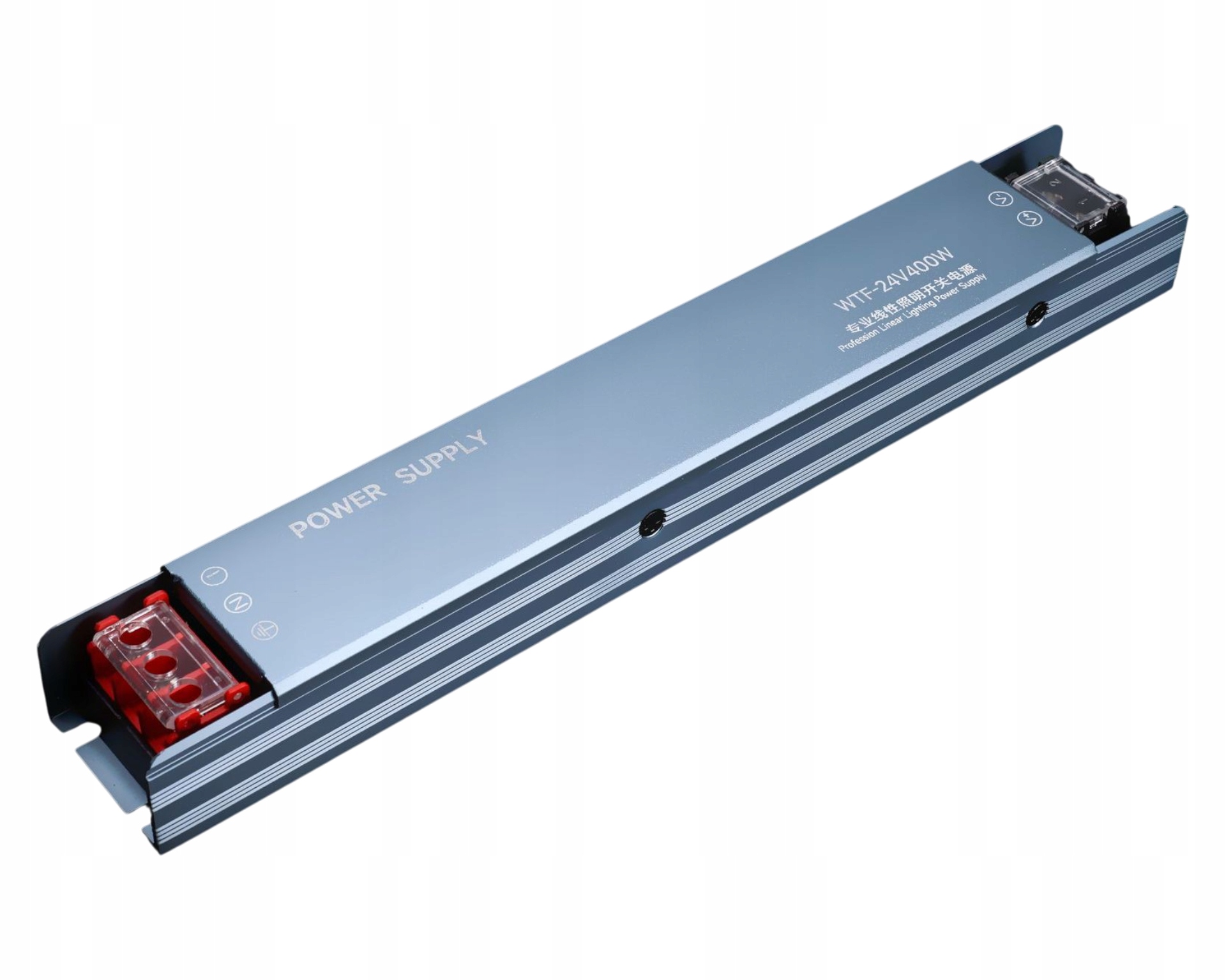 Zasilacz LED 24V 400W Slim WTF-24V400W to profesjonalny, aluminiowy zasilacz klasy premium, przeznaczony do taśm LED, neonów LED oraz oświetlenia architektonicznego 24V DC. Jego smukła obudowa typu SLIM umożliwia montaż w miejscach o ograniczonej przestrzeni – w profilach aluminiowych, sufitach podwieszanych, szafkach i zabudowach meblowych.