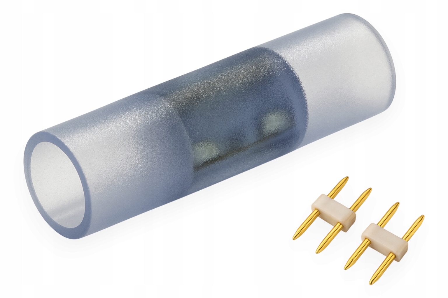 Wykonana z elastycznego, półprzezroczystego tworzywa, złączka zapewnia szczelne dopasowanie i stabilne osadzenie neonu. W zestawie znajdują się dwa miedziane piny o rozstawie 7–8 mm, które gwarantują pewne przewodzenie prądu i trwałe połączenie elektryczne. Montaż jest bardzo prosty – bez lutowania, wystarczy wsunąć obie końcówki neonu i zatrzasnąć złączkę.