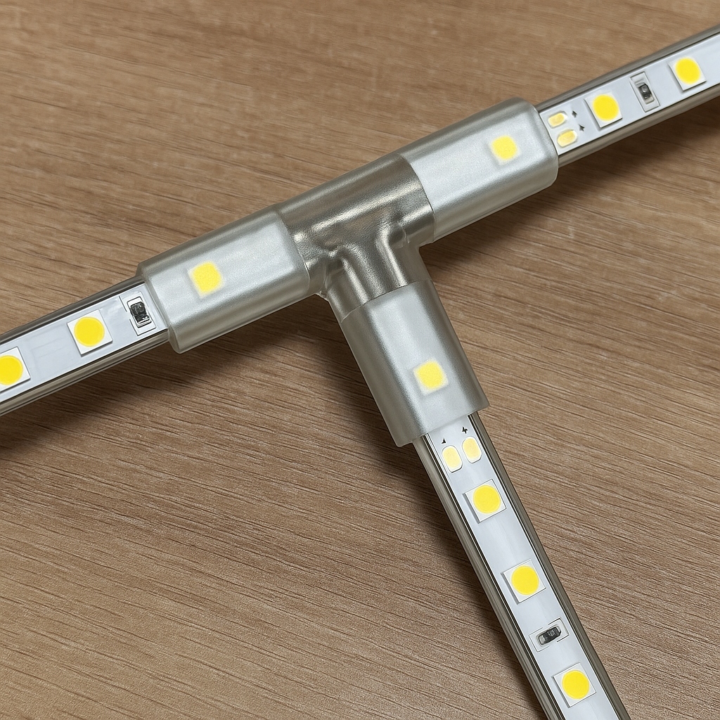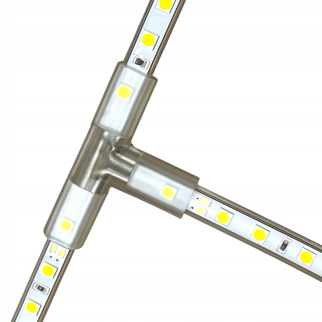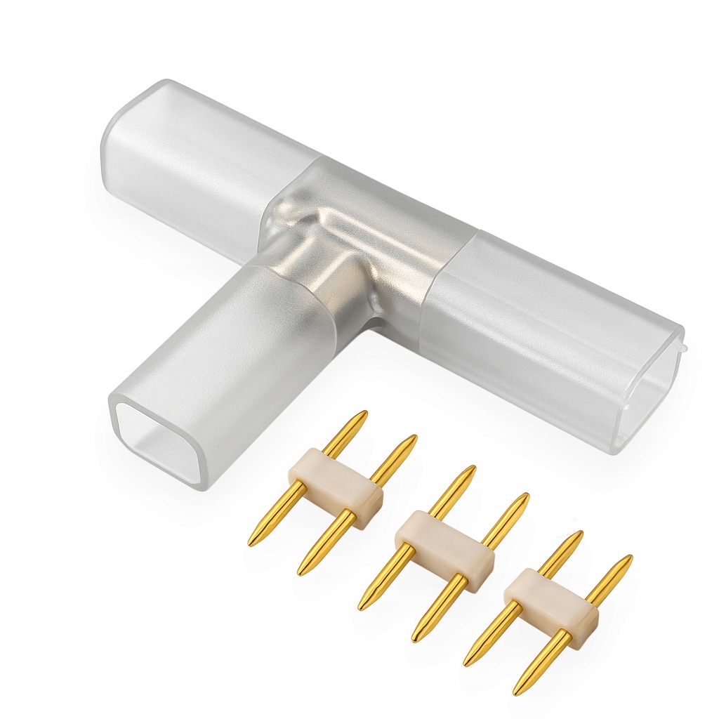 Złączka typu T do taśm LED 230V 10mm to praktyczny rozgałęźnik umożliwiający połączenie trzech odcinków taśmy LED w układzie rozdzielającym. Pozwala łatwo stworzyć oświetlenie w kształcie litery T, idealne do witryn, sufitów podwieszanych, półek, mebli, reklam i dekoracji.
